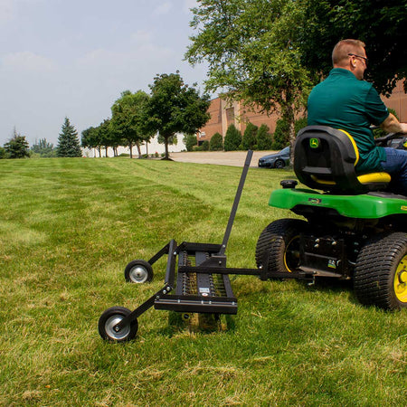 The JRCO 46" Tow-Behind Tine Rake Dethatcher offers the perfect balance of maneuverability and productivity, delivering commercial-grade dethatching for lawns of all sizes. Designed for near-universal compatibility, this tow-behind dethatcher attaches to most mowers with a simple single-pin hitch and features an easy-to-operate raise/lower lever that adjusts the tines without lifting the mower deck.