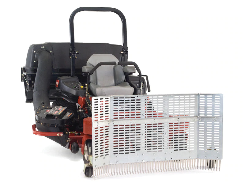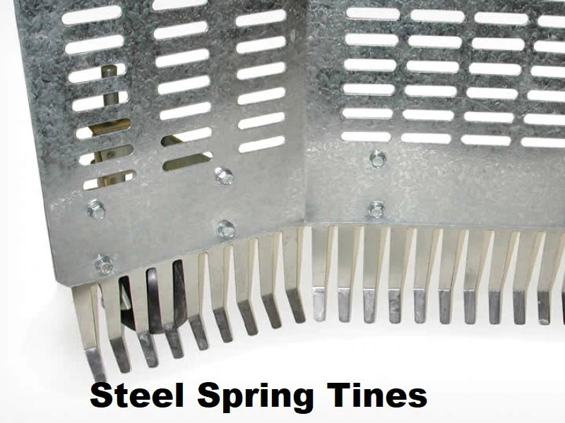 The one-piece, 55 inch wide galvanized steel blade has supports at the top, center and bottom for durability. The Lawn Mower Leaf Plow rides on two adjustable caster wheels. Flat 4 1/2 inch long stainless spring steel tines allow the Plow to push leaves on uneven surfaces without damaging turfgrass.