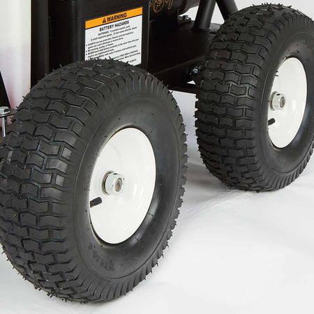 Large 15-inch pneumatic tires and rugged steel roll cage -
