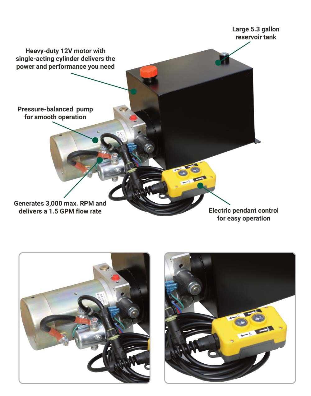 • Heavy-duty 12V motor with double-acting cylinder delivers the power and performance you need for power-up/power-down circuits with load holding on both A and B ports