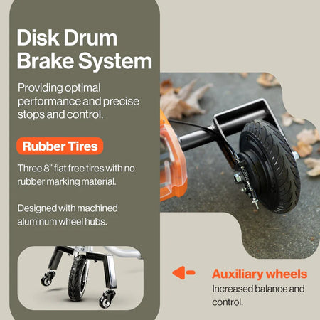 Flat-Free 8" Tires – No more worrying about punctures.